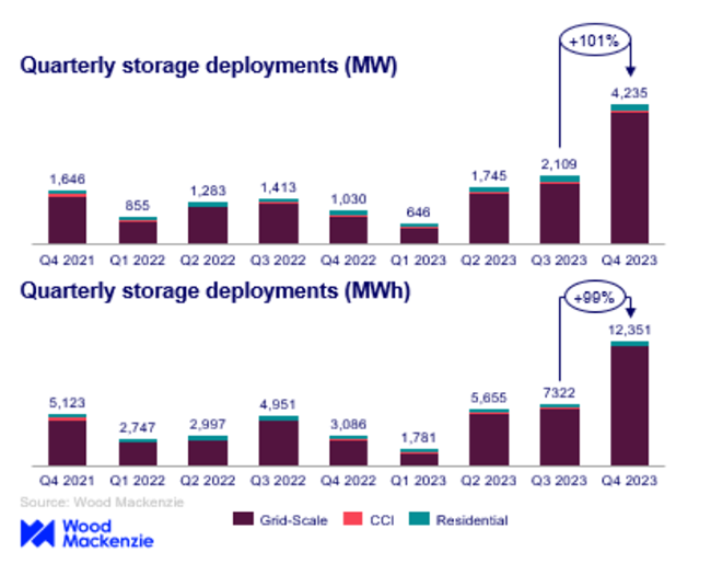In the final quarter of 2023, the U.S. energy storage market set new deployment records across all sectors, with 4,236 MW/12,351 MWh installed during that period. This marked a 100% increase from Q3, as reported by a recent study. Notably, the grid-scale sector achieved more than 3 GW of deployment in a single quarter, nearly reaching 4 GW on its own, according to the latest U.S. Energy Storage Monitor publication by Wood Mackenzie and the American Clean Power Association (ACP). The addition of 3,983 MW in new capacity represents a 358% growth compared to the same period in 2022. John Hensley, Vice President of Markets and Policy Analysis at ACP, emphasized the industry’s significant growth momentum, stating, “The energy storage industry continues its remarkable expansion, with a record-breaking quarter contributing to a successful year for the technology.” For further information, please follow Amensolar! Residential Solar Battery, Renewable Energy Products, Solar Battery Energy Storage Systems, etc. topics. Subscribe on your favorite platform. In the U.S. residential sector, deployments reached 218.5 MW, surpassing the previous quarterly installation record of 210.9 MW from Q3 2023. While California saw market growth, Puerto Rico experienced a decline likely linked to incentive changes. Vanessa Witte, senior analyst at Wood Mackenzie’s energy storage team, highlighted the robust performance of the U.S. energy storage market in Q4 2023, attributed to improved supply chain conditions and decreasing system costs. Grid-scale installations led the quarter, exhibiting the highest quarter-on-quarter growth among segments and ending the year with a 113% increase compared to Q3 2023. California remained a leader in both MW and MWh installations, closely followed by Arizona and Texas.